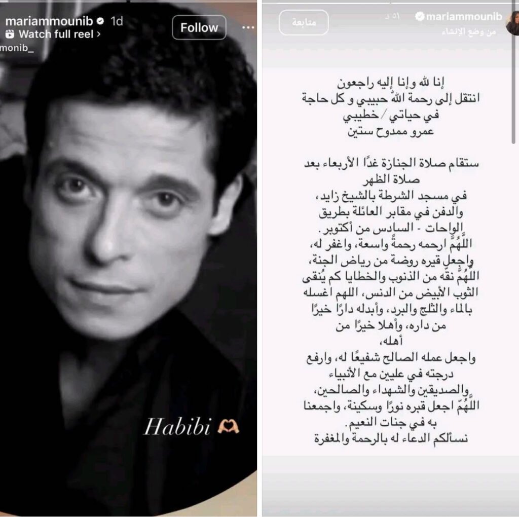- في العالم العربي، تفاعل واسع مع خبر وفاة خطيب الفنانة مريم عامر منيب، حيث ودّعته بكلمات مؤثرة وطلبت الدعاء له بالرحمة.