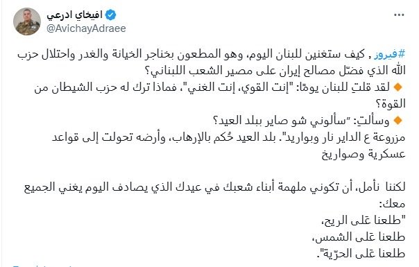 أدرعي يستذكر فيروز بعيدها Sabrina News 1 year ago أدرعي يسأل فيروز كيف ستغنين للبنان اليوم. الجدير ذكره أنّ طيران الإسـ.ـرائيلي كان قد اعتـ.ـدى على غرفة فيروز في بعلبك في وقت سابق.* شارك