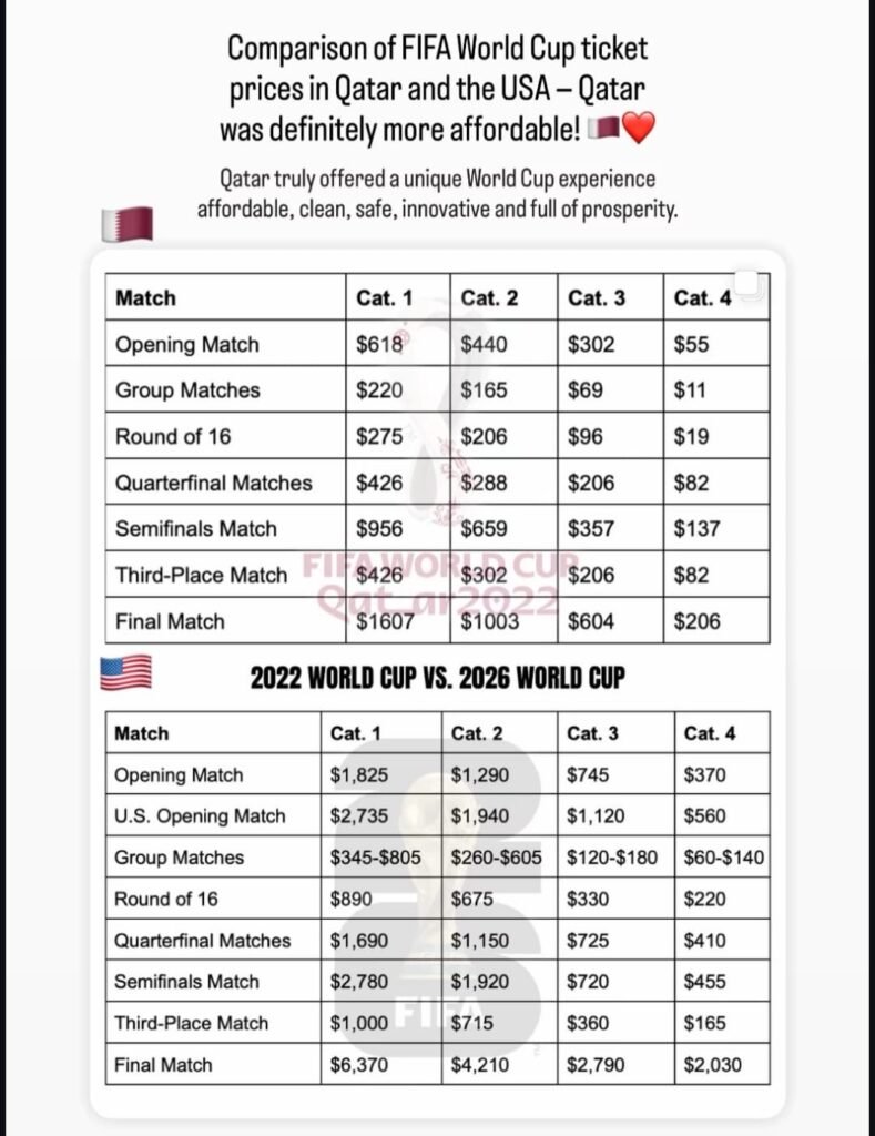 فقد أعلنت “الفيفا” عن أسعار مبدئية تبدأ من 120 دولارًا للمباريات العادية، وتصل إلى أكثر من 3000 دولار للمباراة النهائية في الفئات المميزة، ما يعني زيادة تتراوح بين 150% إلى 250% عن نسخة قطر.
