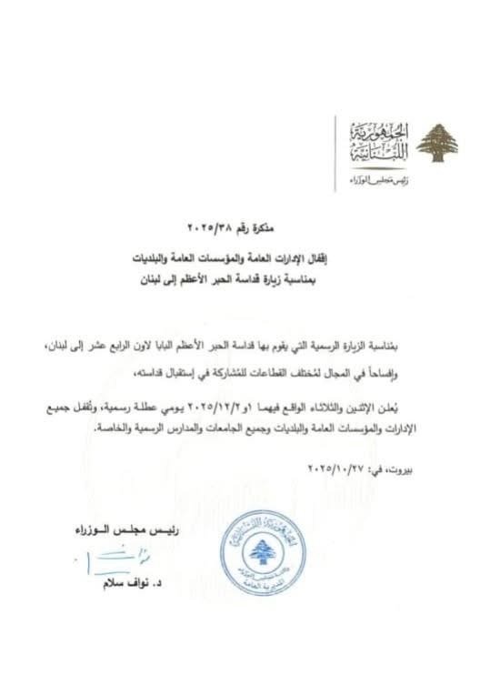أعلنت وزارة التربية في لبنان عن إقفال جميع المدارس والثانويات والمعاهد والجامعات الرسمية والخاصة يومي 1 و2 كانون الأول 2025، وذلك بمناسبة زيارة قداسة الحبر الأعظم البابا لاون الرابع عشر إلى لبنان. هذا القرار يأتي استعداداً لهذا الحدث التاريخي، الذي يحمل طابعاً دينياً وإنسانياً ودبلوماسياً مهماً للبنان والمنطقة.