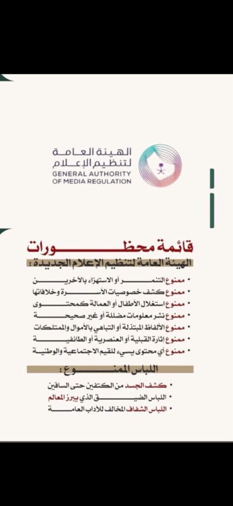 ⚠️ تنبيه: مخالفة هذه القواعد قد تعرض المخالفين للمساءلة القانونية والغرامات، ضمن جهود السعودية لضبط الإعلام الرقمي وحماية القيم العامة