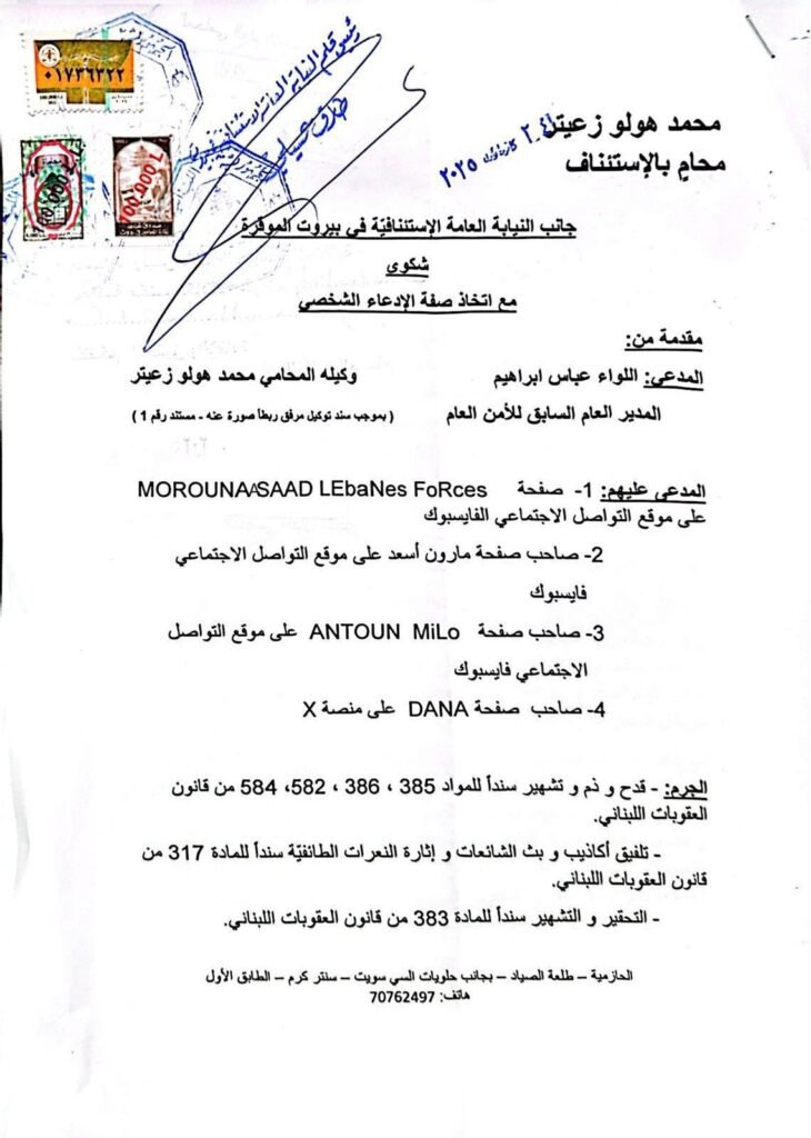 *اللواء عباس إبراهيم يتقدّم بشكوى قضائية ضد محرّضي الفتنة والتحريض وتلفيق الأكاذيب وبثّ الشائعات والتشهير والتحقير*