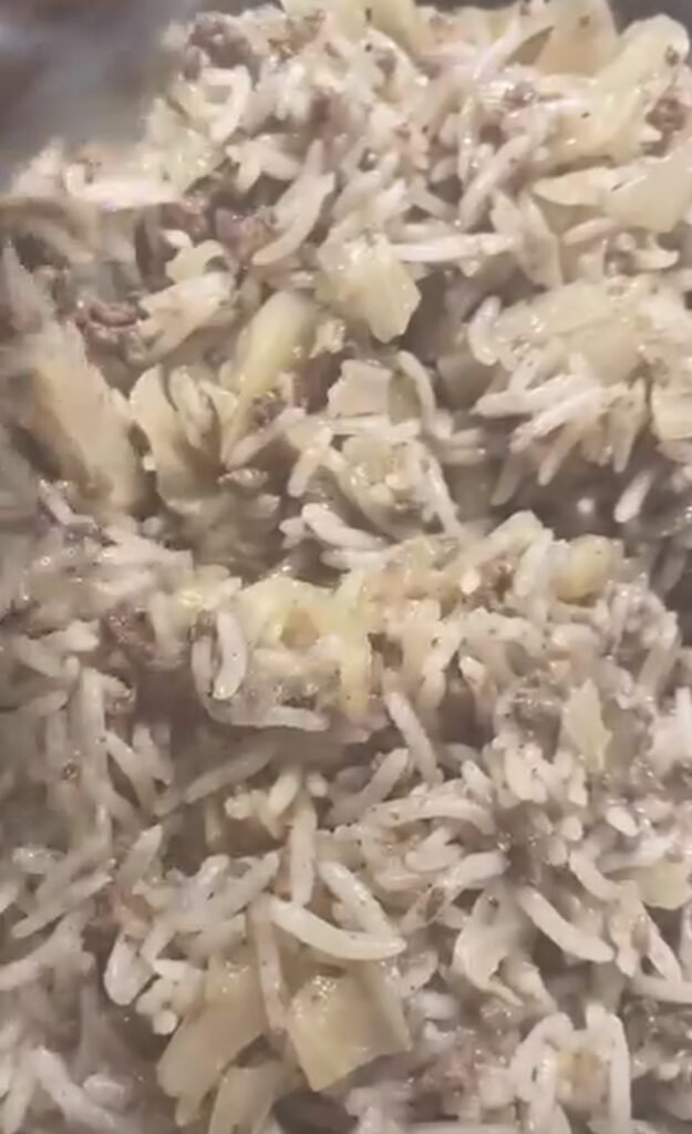 - تُغطّى الطنجرة وتُترك على نار هادئة حتى ينضج الأرز بالكامل.
