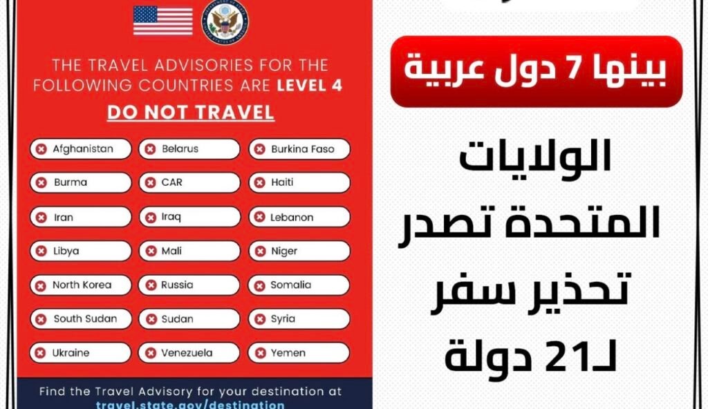 أصدرت الولايات المتحدة تحذير سفر يشمل 21 دولة حول العالم، منها 7 دول عربية، بسبب المخاطر الأمنية والصحية المحتملة. تعرف على التفاصيل الكاملة.
