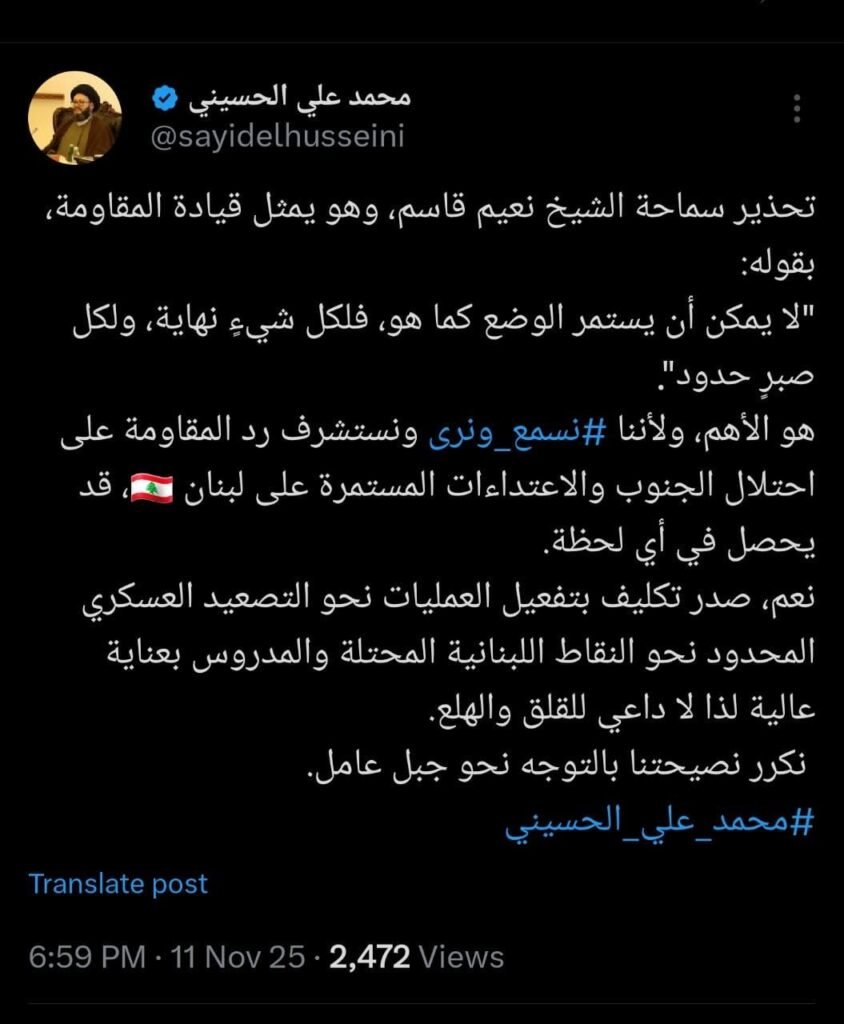 تشهد الساحة اللبنانية موجة جديدة من القلق بعد ارتفاع نبرة الخطاب السياسي والديني حول التطورات في الجنوب، حيث عاد الشيخ محمد علي الحسيني إلى الواجهة بدعوته إلى “الانتباه وعدم ترك جبل عامل”، في وقت أصدر الشيخ نعيم قاسم، نائب الأمين العام لحزب الله، تصريحاً لافتاً قال فيه إن «الوضع لا يمكن أن يستمر كما هو، فلكل شيء نهاية».