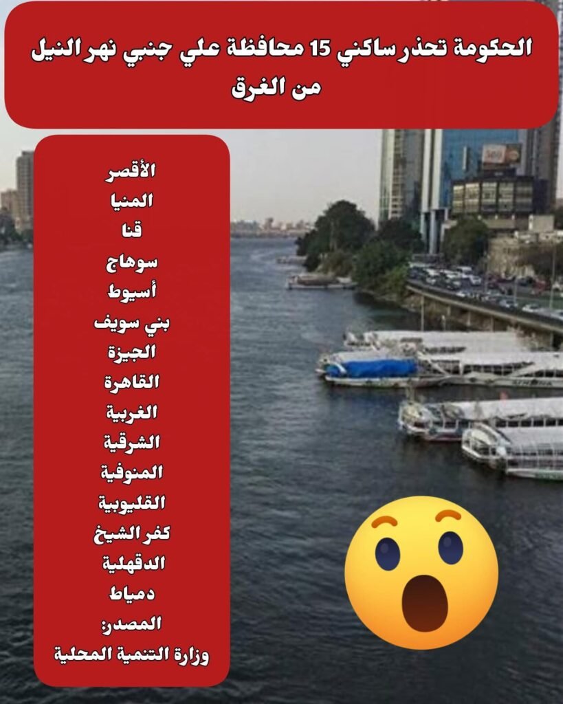 أصدرت الحكومة المصرية، مساء اليوم، بيانًا رسميًا يحذّر سكان 15 محافظة تقع على جانبي نهر النيل من احتمالية ارتفاع منسوب المياه وحدوث فيضانات محلية خلال الأيام المقبلة نتيجة التغيرات المناخية وزيادة تدفقات المياه في بعض المناطق.