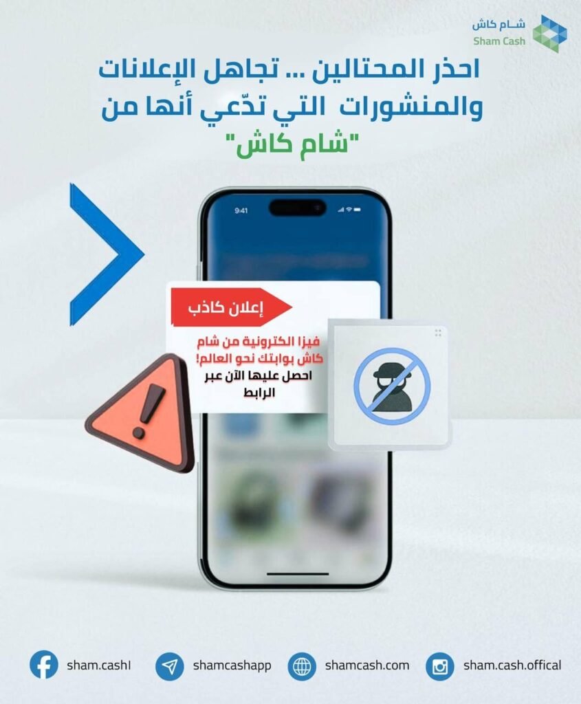 حذّر تطبيق شام كاش مستخدميه من وجود صفحات وروابط مزيفة على الإنترنت تستهدف سرقة البيانات المالية والمعلومات الشخصية. وأكد التطبيق أن هذه الصفحات قد تظهر مشابهة تماماً للصفحة الرسمية، ما قد يضلل المستخدمين ويعرض حساباتهم للخطر.