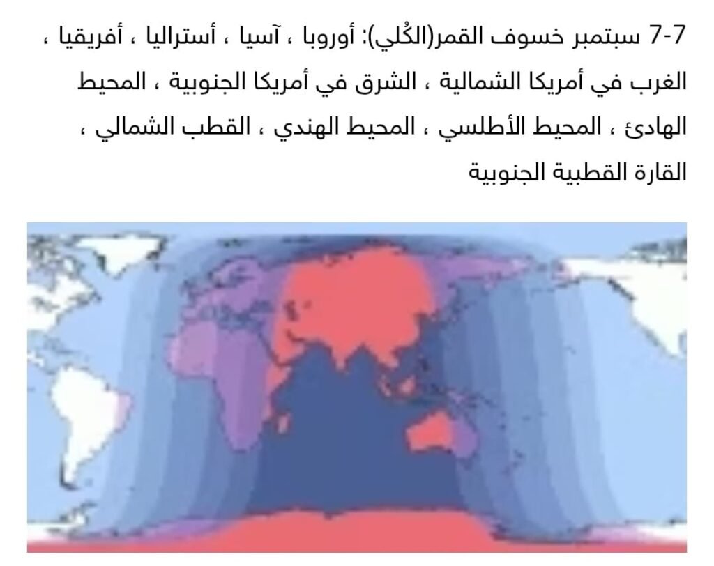 تشهد مناطق آسيا وأفريقيا وأوروبا والعالم العربي الليلة خسوفًا كليًا للقمر، حيث يدخل القمر بالكامل في ظل الأرض، فيحجب ضوء الشمس عن انعكاسه، وتستمر هذه الظاهرة بين الساعة 8:31 و9:52 مساءً بتوقيت بيروت، على أن يبدأ الانجلاء ويعود القمر بدراً كما كان الساعة 10:52.
