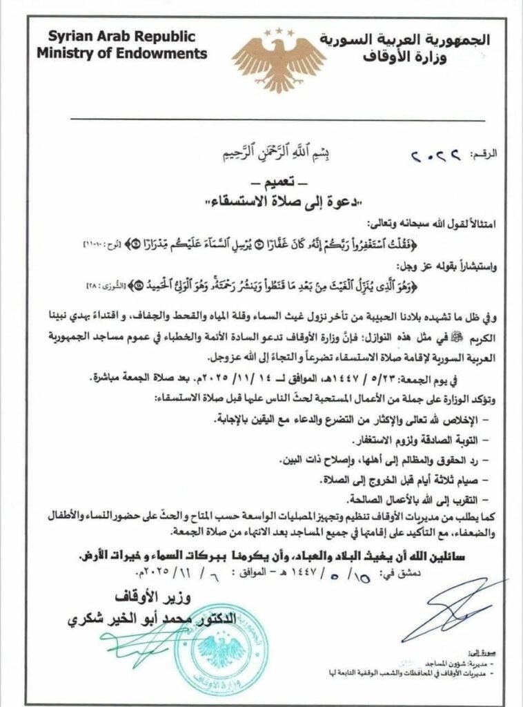 دعت وزارة الأوقاف السورية جميع الأئمة والخطباء في عموم مساجد سوريا إلى إقامة صلاة الاستسقاء يوم الجمعة 14 نوفمبر / تشرين الثاني 2025، الموافق لـ 23 جمادى الأولى 1447 هـ، وذلك بعد صلاة الجمعة مباشرة.