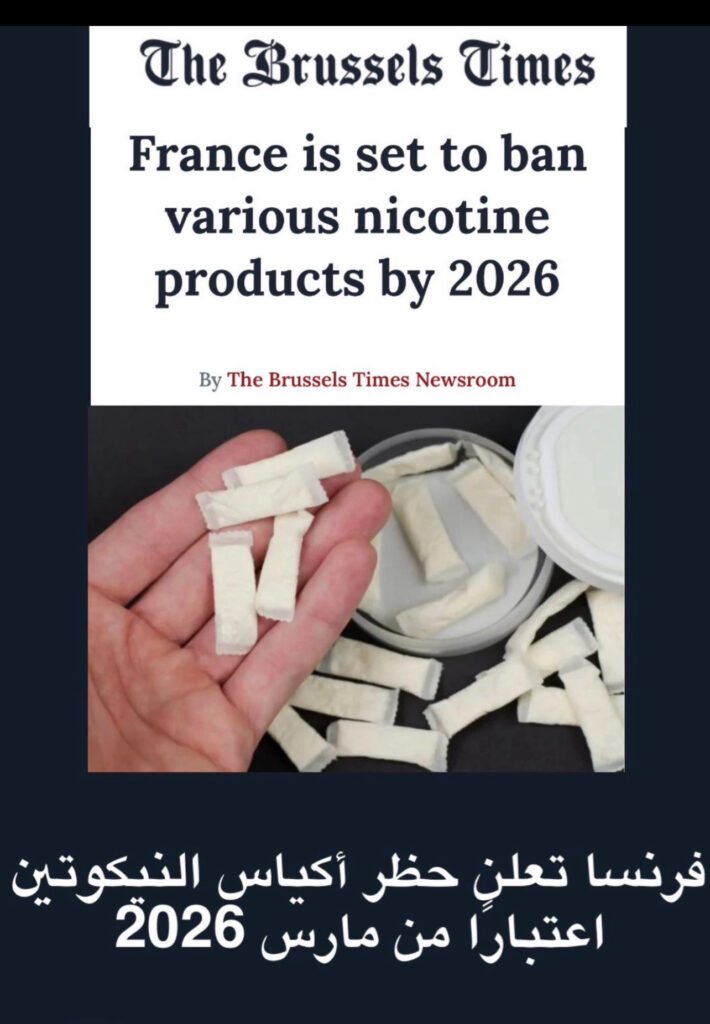 أعلنت الحكومة الفرنسية عن قرار رسمي يقضي بحظر بيع وإنتاج وتسويق واستيراد أكياس النيكوتين، على أن يدخل حيّز التنفيذ اعتبارًا من شهر مارس/آذار 2026، وذلك في إطار جهودها لحماية الصحة العامة، ولا سيّما صحة الأطفال والمراهقين.