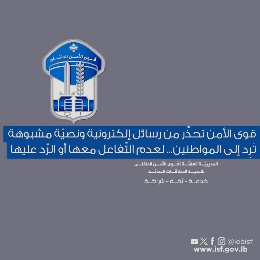 قوى الأمن تحذّر من رسائل إلكترونية ونصيّة مشبوهة تَرِد إلى المواطنين… لعدم التّفاعل معها أو الرّد عليها.