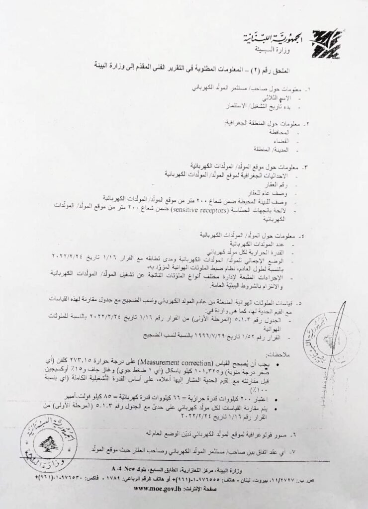 1️⃣ يُطلب من جميع أصحاب ومستثمري مولدات الكهرباء ضمن الأحياء السكنية، المجمعات السياحية، المراكز التجارية، المستشفيات، المدارس، الجامعات، المصانع والمعامل، الذين يستثمرون مولدًا أو أكثر بقدرة تشغيلية ابتداءً من 85 كيلو فولت-أمبير، تقديم تقرير فني إلى وزارة البيئة خلال مهلة أربعة أشهر من تاريخ البلاغ، وإيداع نسخة عنه لدى مصلحة المؤسسات المصنفة في بلدية بيروت.