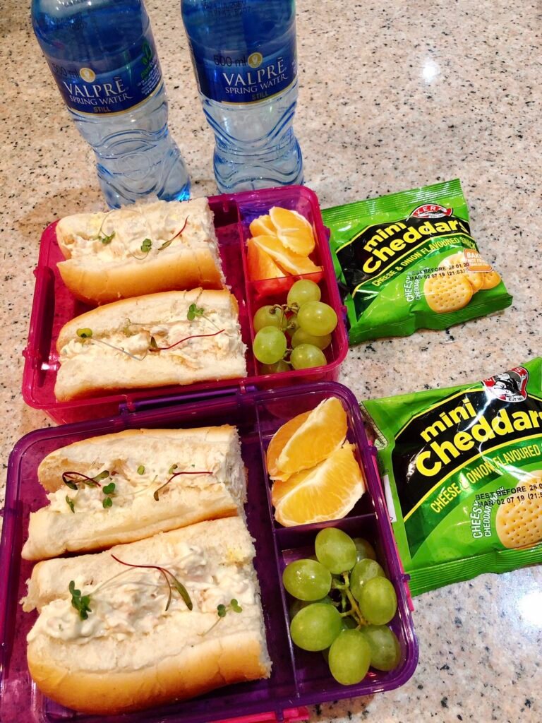 - الاثنين: سندويش لبنة وزعتر + خيار + تفاحة + بسكويت محلي.